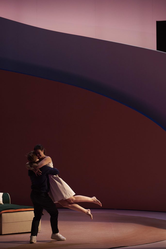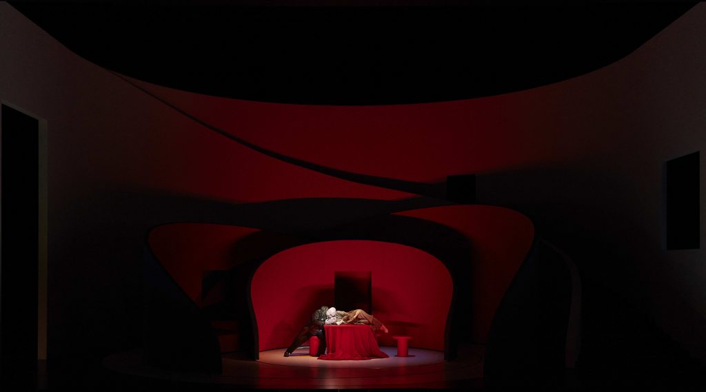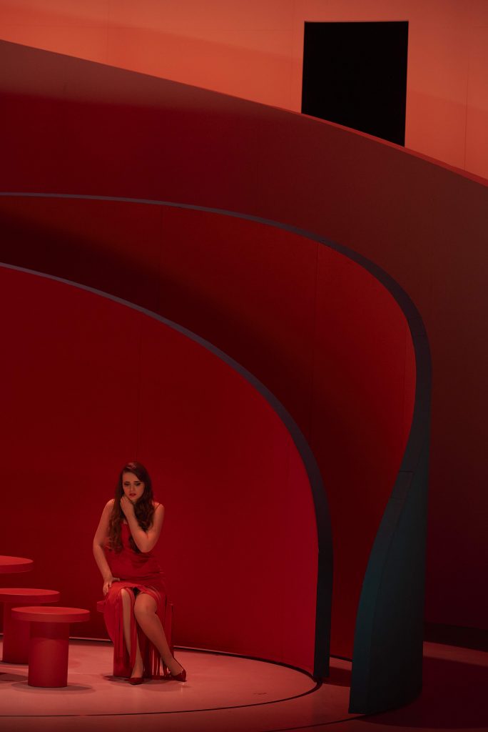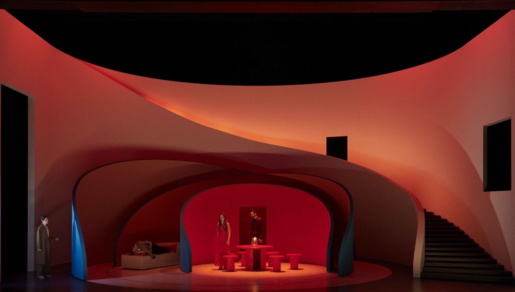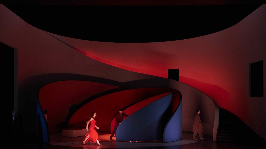 Des changements scéniques renforcés par le choix des coloris des décors courbes et structurés par un escalier sculptural que sont le rouge vif, le bleu et le blanc, qui viennent alors souligner l’accélération du drame auquel assiste le spectateur. Celui-ci voit ses émotions s’intensifier au gré des épisodes de cet opéra italien.