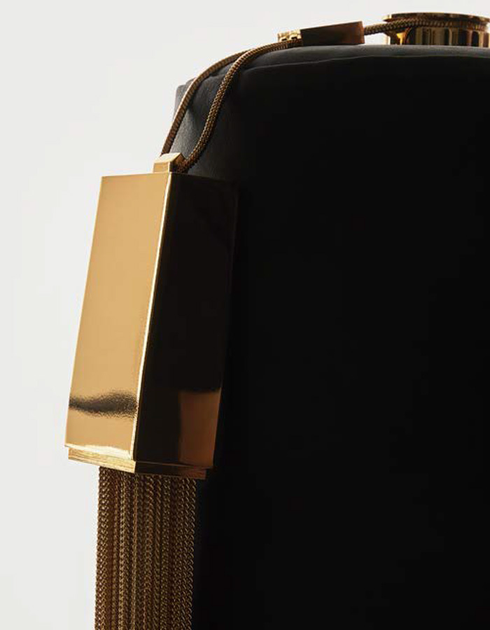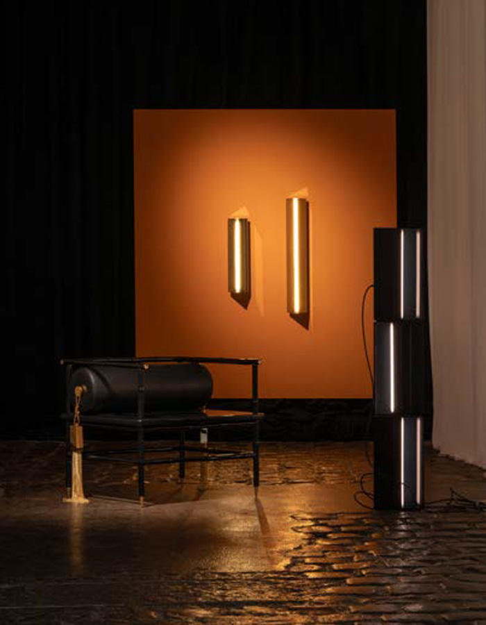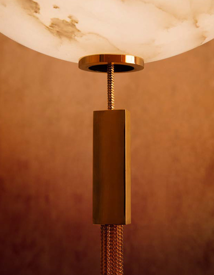 Avec ses allures de trône, l’assise se dessine autour d’une structure en bambou laqué noir sur laquelle est posé un coussin rembourré de mousse de polyuréthane recouvert de cuir de taureau. Une silhouette singulière parachevée par des détails en or chromé ornés de chaînes. Des chaînes dorées que l’on retrouve sur Lucifuge, un plafonnier reconnaissable à sa sphère en albâtre.