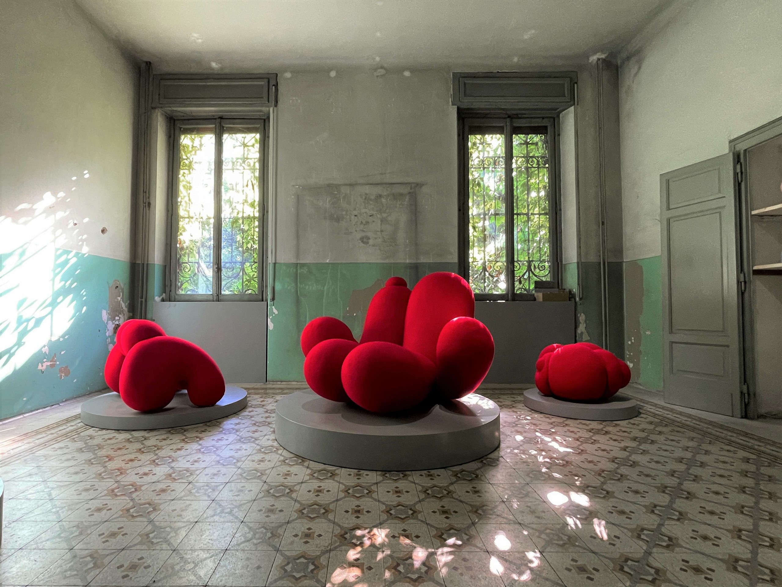 Après une dizaine d’années de bons et loyaux services pour la maison Cartier où elle a exploré l’univers de la joaillerie, la créatrice Lara Bohinc s’est lancée dans celui du mobilier en ouvrant son propre studio en 2016. Obsédée par la déconstruction et la reconfiguration de formes géométriques pures, la créatrice sert un design tout en rondeurs, à l’image de sa dernière collection « Peaches » présentée à l’occasion de la Milan Design Week comme une célébration de la féminité. Composée de trois assises, « Big Girl », « Derrière » et « Peachy », déclinables en rouge et rose, la série s’inspire sans équivoque du corps féminin. Les pièces ont été fabriquées à la main dans un atelier de tapisserie d’ameublement du nord de Londres, avec une structure de bois et d’acier et une couche de mousse pour créer des courbes douces.