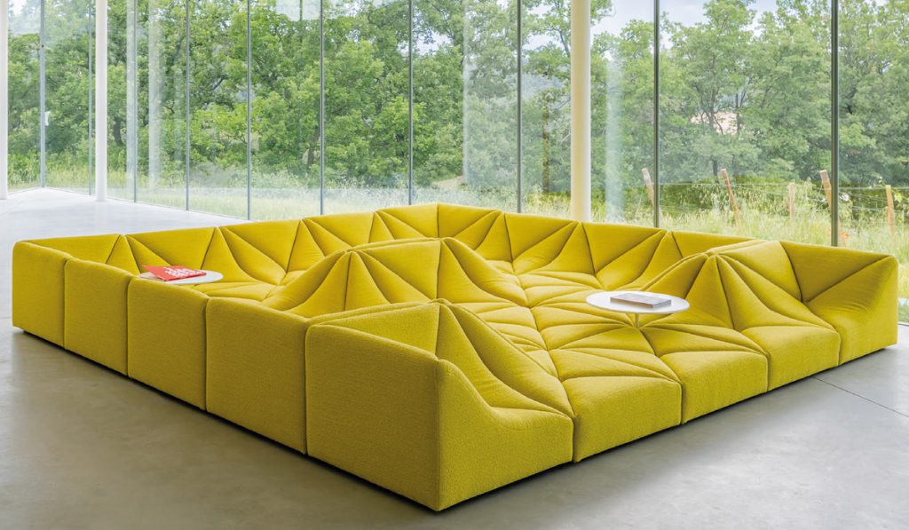 des configurations multiples, ce mobilier modulaire crée un « paysage habitable » aléatoire ondoyant et mouvant. Un espace de vie sur mesure prônant un nouvel art de vivre dont six maquettes déclinent les configurations possibles des modules tandis que c’est le Modèle 5 du Programme Paulin que l’exposition met en scène. Aux lignes ondoyantes du pavillon Niemeyer répondent les « formes libres » et sensuelles imaginées par Paulin pour décloisonner l’espace. Outre les systèmes d’étagères modulables, du Tapis Siège (1968) aux modules organiques de l’Ensemble Dune (1970), les pièces témoignent de la vision éminemment moderne, non statique, de l’espace chez Paulin : tel un origami géant, le sol se plie et s’articule pour qu’on s’y assoie…