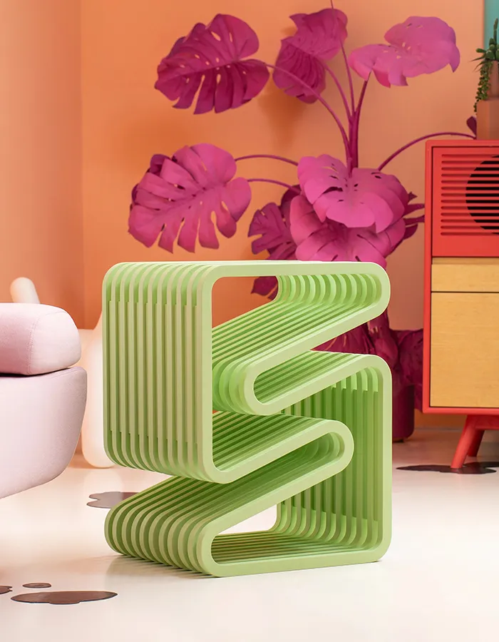 L’œil est d’abord accroché par les silhouettes : des lignes fluides, stratifiées, comme issues d’un mouvement figé dans l’espace. Les meubles et accessoires de P.metric Studio – fauteuils sculpturaux, tables ondulantes, guéridons modulés – semblent dessinés par la géométrie du vent. On y lit une parenté avec l’architecture paramétrique, ce courant récent qui explore les potentiels de la modélisation numérique pour générer des formes inédites, souples et organiques. Mais chez ce cabinet, la technologie n’éclipse jamais la matière : elle la sublime.