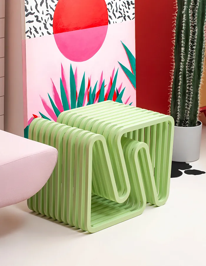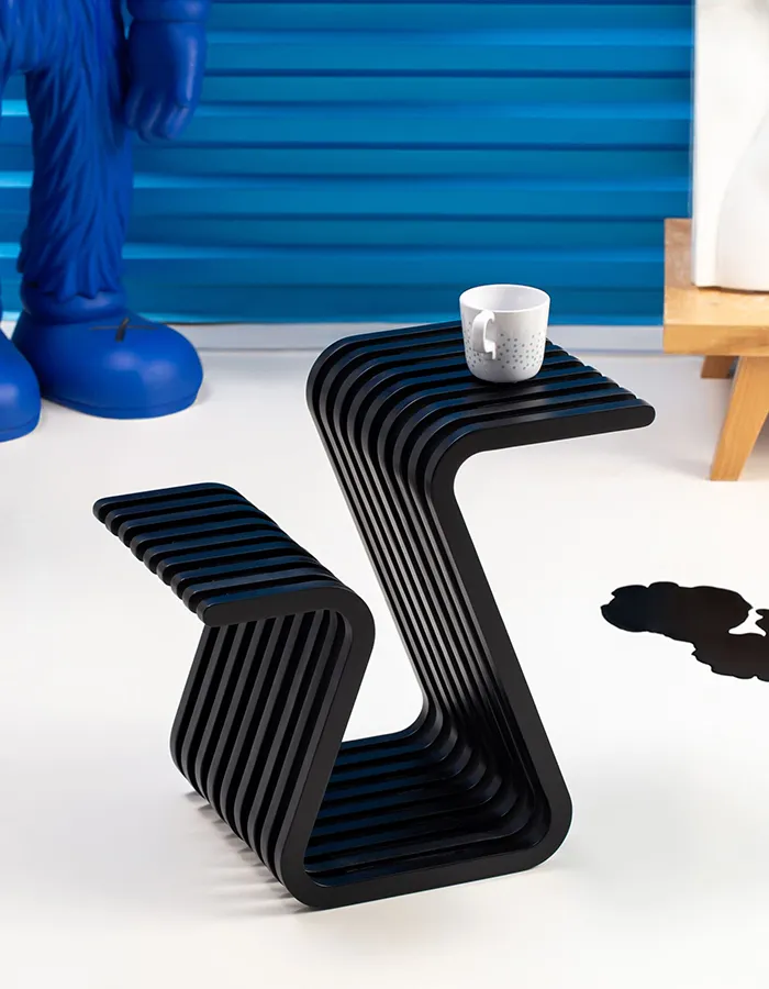 L’œil est d’abord accroché par les silhouettes : des lignes fluides, stratifiées, comme issues d’un mouvement figé dans l’espace. Les meubles et accessoires de P.metric Studio – fauteuils sculpturaux, tables ondulantes, guéridons modulés – semblent dessinés par la géométrie du vent. On y lit une parenté avec l’architecture paramétrique, ce courant récent qui explore les potentiels de la modélisation numérique pour générer des formes inédites, souples et organiques. Mais chez ce cabinet, la technologie n’éclipse jamais la matière : elle la sublime.