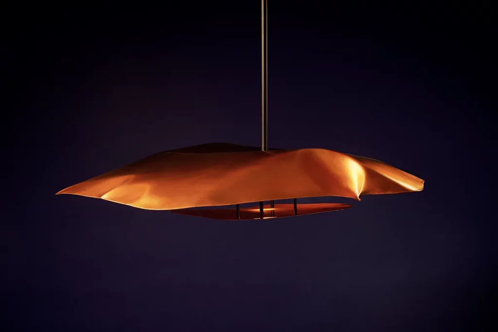 La Volcaneo Lamp constitue un point d’entrée emblématique dans son travail. Plus qu’un luminaire, elle apparaît comme une forme en pleine transformation, traversée par une énergie interne presque tellurique. Ses lignes fluides et imprévisibles évoquent une matière en fusion figée dans un instant de tension, comme si l’objet capturait le moment précis précédant la stabilisation. La lumière n’y est pas un simple outil d’éclairage : elle révèle la dynamique du métal et confère à la pièce une présence sculpturale quasi organique.