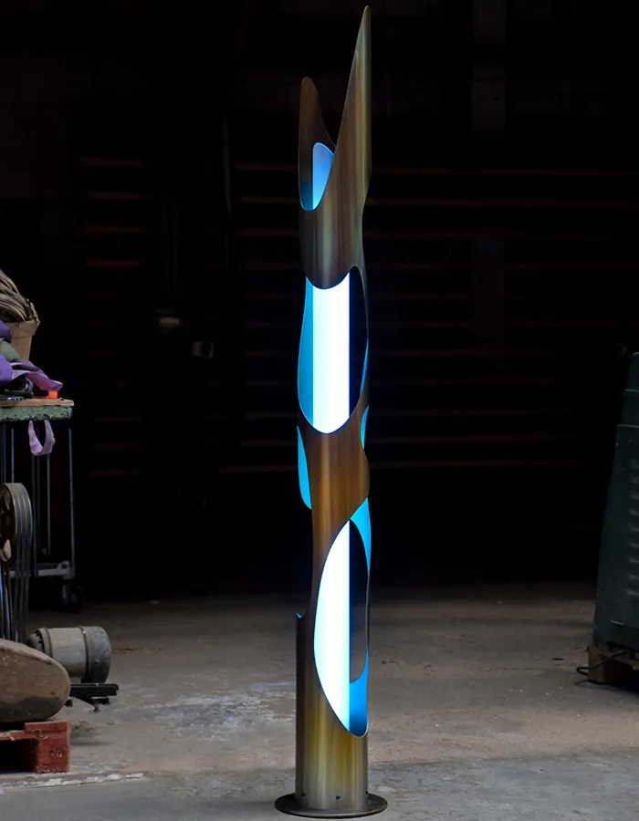 Les sculptures, quant à elles, prolongent cette recherche de manière plus autonome. Parfois monumentales, parfois plus délicates, elles occupent l’espace comme des corps en suspension. Le métal, coloré par la flamme, semble y défier la gravité, se tendre, s’enrouler ou se déployer. Ces pièces ne racontent pas une histoire figée : elles traduisent une émotion, une tension, faisant du matériau un véritable langage plastique.
