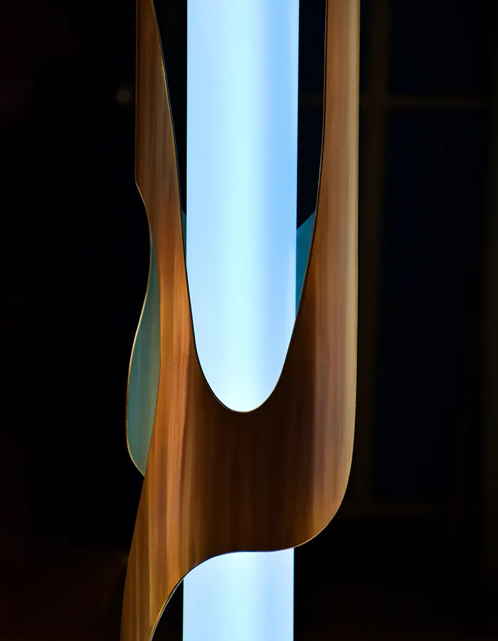 Ce qui relie l’ensemble de ces œuvres – luminaires, mobilier, sculptures – est une quête constante du mouvement dans la forme. Prisca Razafindrakoto utilise notamment un procédé dérivé de l’industrie automobile, l’injection d’air sous pression, qui permet de façonner les objets en gonflant le métal. Comprimé et déformé, celui-ci prend une forme dynamique et organique. La créatrice démontre ainsi que le métal, au-delà de sa dureté apparente, peut exprimer une fluidité presque vivante.