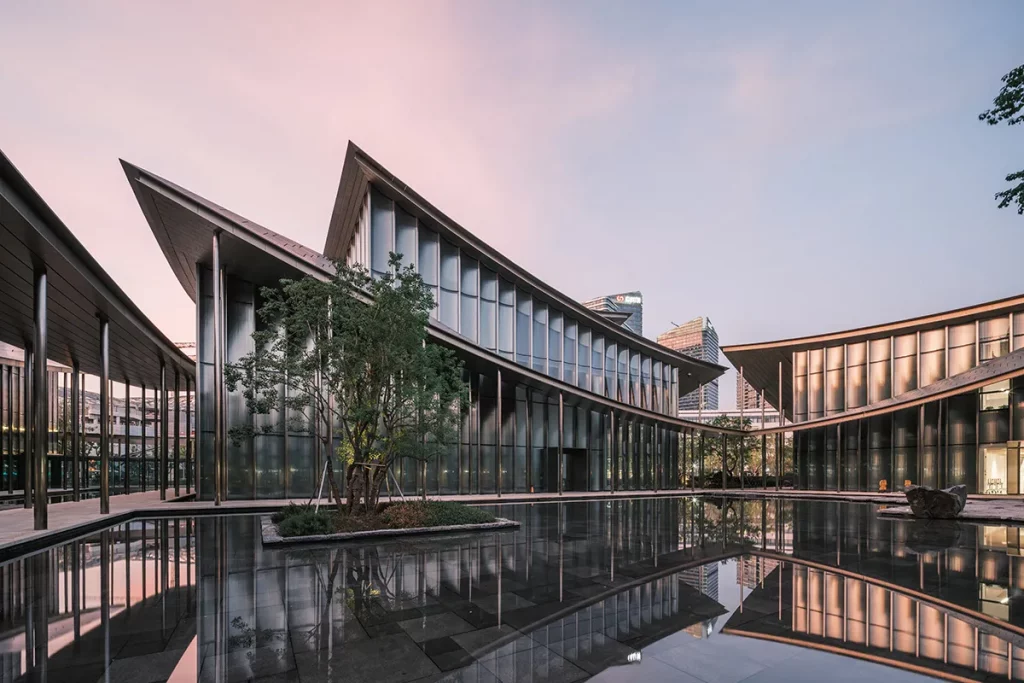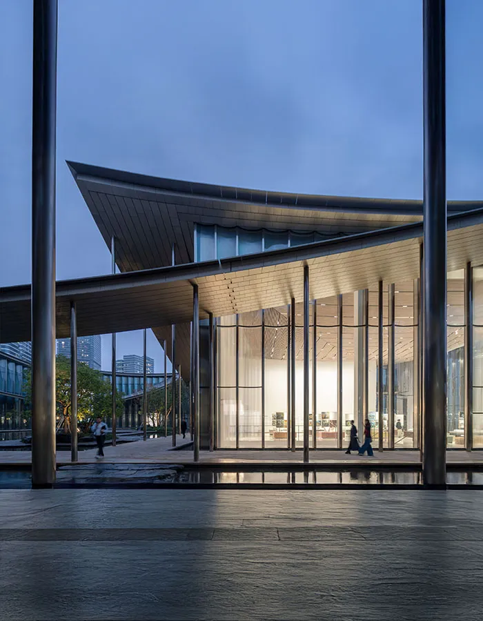 Plutôt qu’un volume unique, le musée se présente comme un ensemble de pavillons reliés entre eux par une toiture continue aux ondulations douces. Cette organisation évoque le lang, ces galeries couvertes qui structurent les jardins chinois classiques, guidant le visiteur sans jamais imposer un itinéraire strict. Ici, l’architecture ne dicte pas le mouvement : elle l’accompagne. On circule entre cours, galeries vitrées et espaces d’exposition comme on traverserait un paysage construit, où chaque transition compte autant que les destinations.