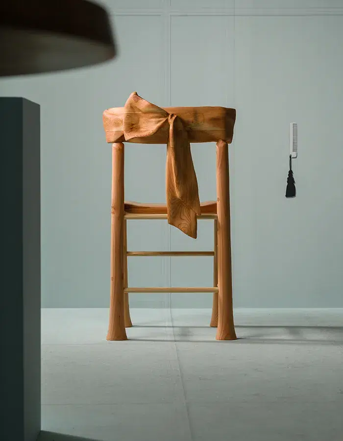 Le studio Sam Klemick a été aperçu au cours de la NYC x Design et de la Design Miami. Le style féérique des collections est renforcé par une union entre le concept de fluidité et de rigidité. Leur passion pour le textile et les beaux matériaux comme le bois fait d’eux un studio qui transgresse les propriétés du bois. Le studio en a décliné les formes, supprimé la symétrie et la circularité parfaite. À partir de matériaux rigides, il offre une nouvelle vision plus harmonieuse avec des courbes et des formes. De cette discipline est née un objet aux formes séduisantes, comme la chaise « Big Wooden Bell Chair » aperçue pendant la Design Miami. La chaise est plus complexe qu’elle ne laisse paraître, il est nécessaire de prêter attention aux détails. Les rainures du bois et l’imperfection naturelle de ce matériau crée un motif aléatoire étonnant. La manière dont le bois est taillé et façonné laisse une impression de mouvements, de passage du vent et du temps. Les faux plis sculptés proviennent d’une technique de façonnage apprise de manière autodidacte.