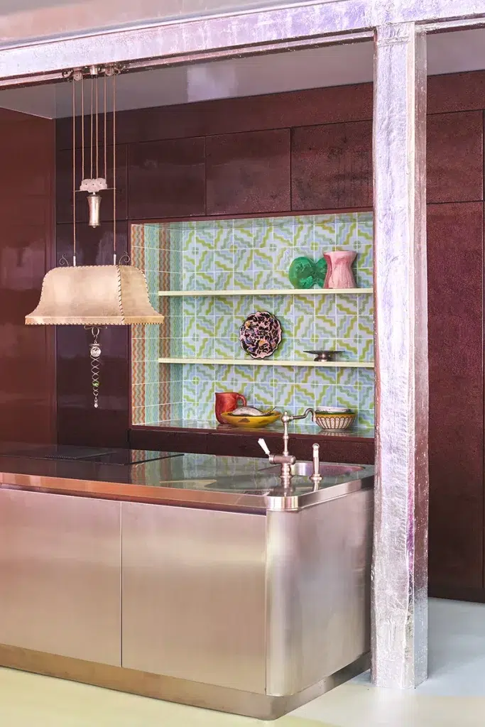 El techo del salón, lacado en un azul cielo intenso, interactúa con las vigas originales adornadas con pan de plata japonés. Una pared de espejos de mosaico difracta la luz como un caleidoscopio. El dormitorio principal se ilumina con un vibrante amarillo solar, un guiño a la fachada vecina, mientras que la habitación de invitados resplandece con un naranja intenso. En toda la casa, el mobiliario es de diseño personalizado, fruto de exigentes colaboraciones con casas como Prelle y Verrier, o de una selección cuidadosa: una sinuosa y espectacular mesa de comedor de ónix y resina, una mesa auxiliar con forma de pompón gigante adornada con pasamanería, o sillas de Frank Lloyd Wright desenterradas en un mercadillo. Incluso la cocina se convierte en un espacio para explorar, combinando una isla de acero inoxidable con una brillante pared de resina con forma de escamas, complementada por un llamativo protector contra salpicaduras del estudio holandés Palet.