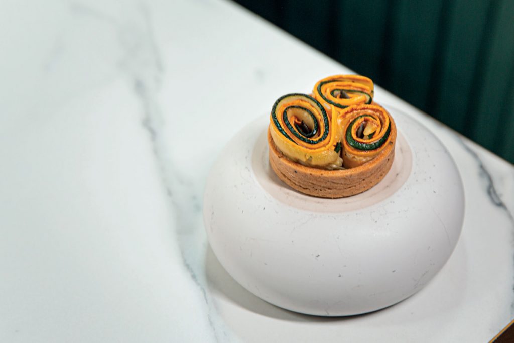 Nous débutons avec une assiette composée de 3 hors-d’oeuvre qui semble simple à première vue, et pourtant, à la dégustation, la justesse des tomates confites, douces et végétales, herbacées, nous réconforte et nous ramène à notre été déjà lointain. Puis, tarte courgette pralin