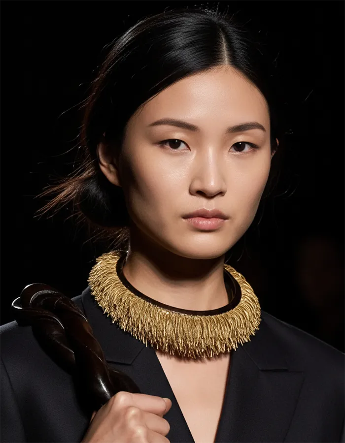 Face à ces cristaux étincelants, une autre tendance règne en maître : l’or, massif et sculptural. Chez Schiaparelli, Balmain et Fendi, l’esthétique se fait solennelle. Colliers plastrons dignes de statues antiques, manchettes empilées jusqu’à l’excès, boucles gravées de formes mythologiques : l’or, travaillé en volumes démesurés, enveloppe les corps d’une aura guerrière. C’est un langage d’opulence, une architecture portable, une armure de luxe. Ici, le bijou ne cherche pas la discrétion : il impose son poids, sa présence, son autorité.