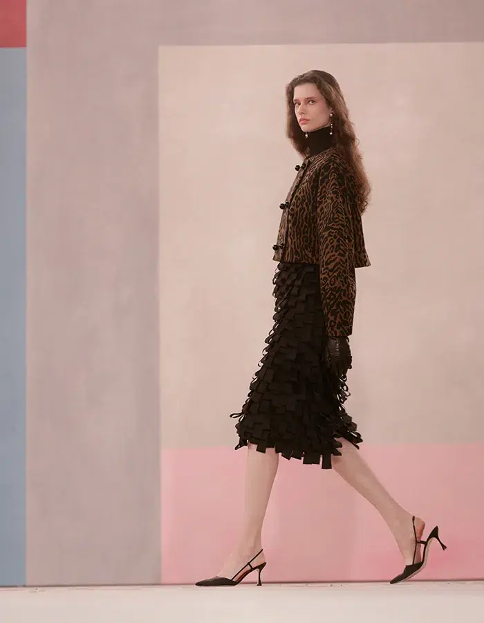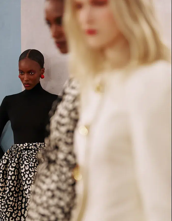 Pour ce qui est des accessoires, des sacs emblématiques de la marque font leur retour comme le Mimi ou le Karlita. Pour l’occasion, le premier se réinvente avec des imprimés léopard graphiques noir et blanc, orné d’un nœud raffiné sur la bandoulière, disponible en violet prune, noir et vert forêt. Quant au Karlita, il est le sac de soirée de cette saison, et plus particulièrement dans le coloris rouge piment. Enfin, des broches en forme de lys et des colliers et boucles d’oreilles en or massif viennent compléter la collection. Celle-ci fait évidemment écho à l’engagement de la maison fondée en 1981 par Carolina Herrera, à travers The Carolina Herrera For Women in the Arts Initiative, une plateforme qui soutient les femmes évoluant dans de nombreuses pratiques artistiques. D’ailleurs, la marque tient à préciser que c’est parce qu’une certaine Diana Vreeland, célèbre journaliste de Harper’s Bazaar et de Vogue, a cru en elle que la créatrice a pu se lancer. Un geste que Carolina Herrera a souhaité reproduire via l’attribution de bourses d’étude en partenariat avec des institutions de haute volée comme le Fashion Institute of Technology, la Nuova Accademia di Belle Arti en Italie, ou encore en soutenant des expositions au musée Thyssen-Bornemisza à Madrid. En résumé, une association nécessaire et qui s’exprime de la plus poétique des manières sur le catwalk.