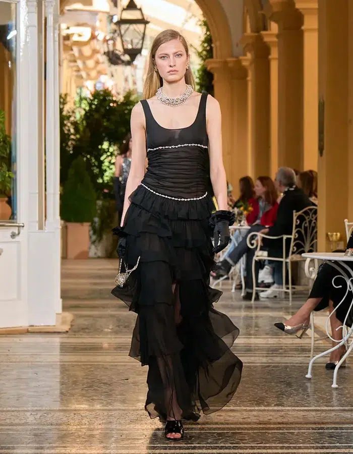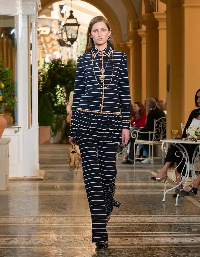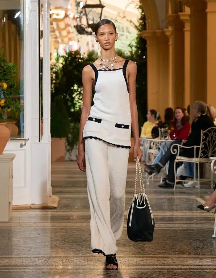 Les mannequins, parées de colliers de perles, lunettes noires oversize et gants longs, incarnaient une féminité assumée, oscillant entre insouciance et raffinement. Les pyjamas du soir rayés, robes à volants bleu ciel et rose pêche, gilets en dentelle et costumes en tweed aux coupes droites composaient une garde-robe estivale luxueuse, ponctuée d’accessoires tels que des minaudières en raphia ornées du double C, chapeaux fleuris en mousseline et foulards en soie.