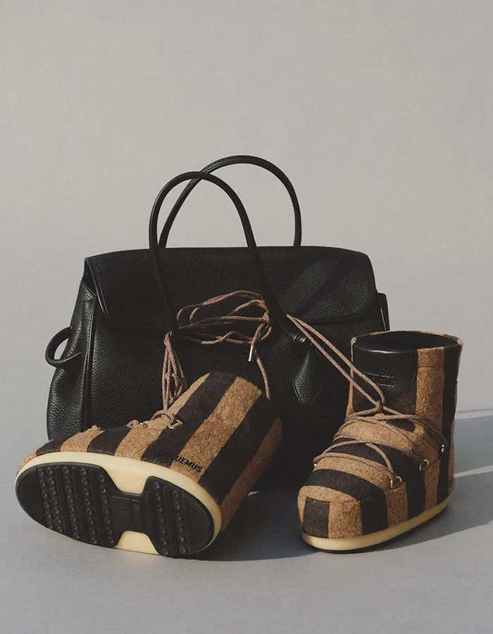 La collaboration entre Jacquemus et Moon Boot détourne un classique de l’après-ski pour en faire un objet de mode à part entière. Fidèle à l’univers de Simon Porte Jacquemus, la Moon Boot est ici repensée comme une pièce sculpturale, presque ludique, où proportions exagérées et matières chaleureuses dialoguent avec une esthétique minimaliste. Les modèles jouent sur des contrastes forts : rayures graphiques, volumes arrondis, textures feutrées, tout en conservant l’essence fonctionnelle de la chaussure iconique.