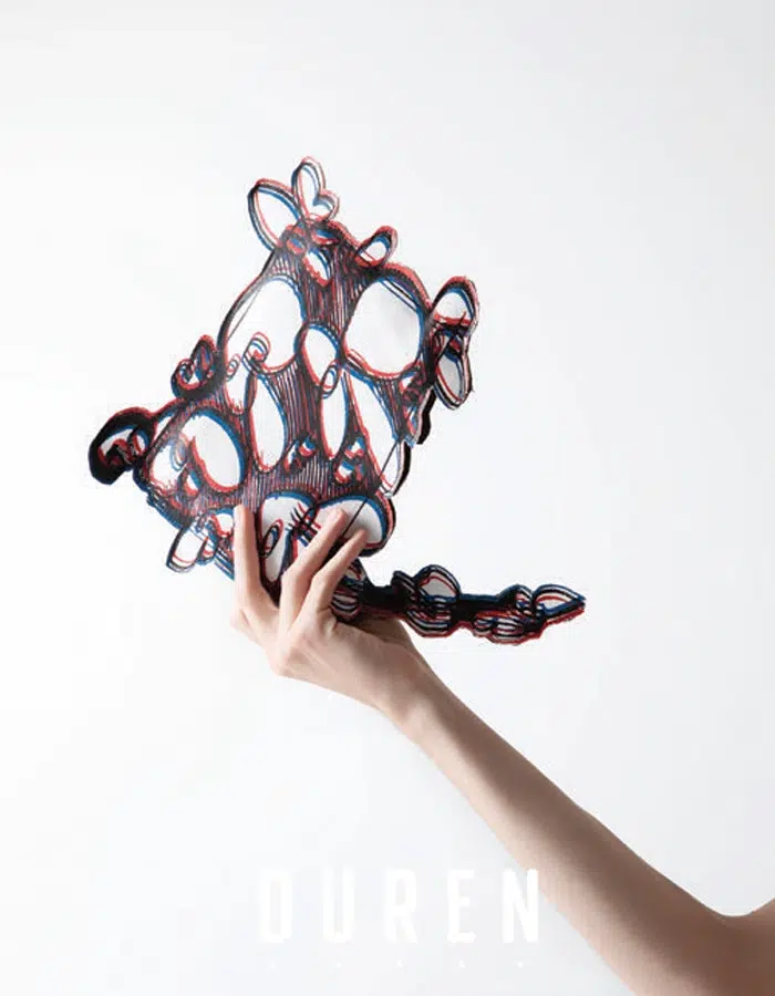 touche de couleur et d’originalité. Le mouvement traverse la toile comme un trait spontané, dont la trajectoire brute et aléatoire se retrouve imprimée. Il exprime une impulsion qui émerge des contraintes et s’en trouve libérée. Cette esquisse conserve une certaine naïveté et prend forme pour devenir un véritable objet, à la manière des croquis de l’architecte Frank Gehry. Duren, une marque libre jouant avec les textures et les couleurs pour un style surprenant et inégalé.