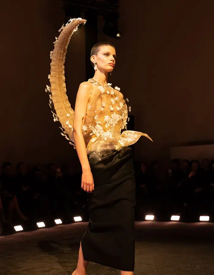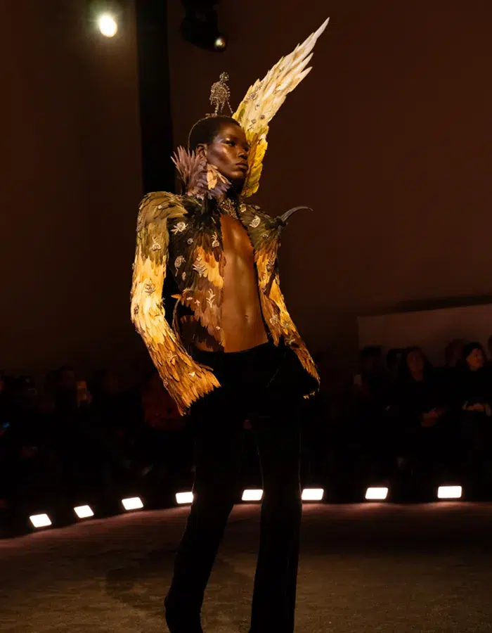 Avec Schiaparelli, le rêve bascule dans l’étrangeté. Pour le printemps-été 2026, Daniel Roseberry puise son inspiration dans un choc esthétique : la découverte du Jugement Dernier de Michel-Ange. Une révélation qui irrigue toute la collection haute couture, peuplée de chimères, de silhouettes anthropomorphes et de créatures hybrides. Sur le podium, les mannequins apparaissent comme sorties d’un autre monde : dentelles découpées à la main et travaillées en bas-relief, plumes peintes une à une, tulles fluorescents superposés pour créer un effet sfumato, emprunté à la peinture de la Renaissance. Les vêtements deviennent presque des sculptures, prolongés par des ailes, des becs, des yeux cabochons. Roseberry convoque autant Michel-Ange qu’Elsa Schiaparelli, ses obsessions marines et célestes, son goût pour le surréalisme et le trouble. Ici, la haute couture ne cherche pas à rassurer : elle fascine, dérange, hypnotise. En ouvrant symboliquement le fameux “trou de serrure” cher à la maison, le créateur semble inviter à pénétrer un monde où la mode se fait mythe vivant.