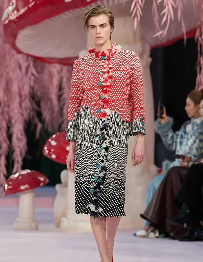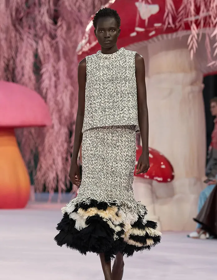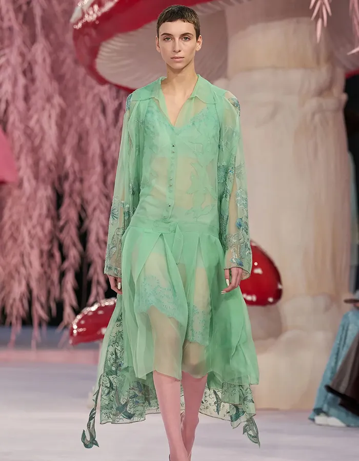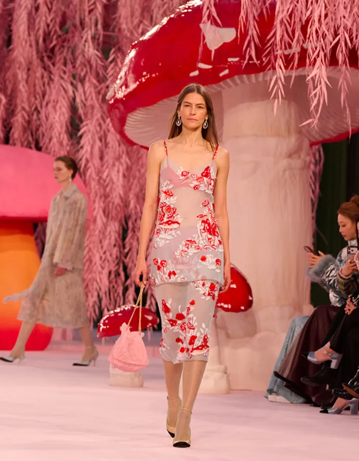 Changement de tempo chez Chanel. Pour sa toute première collection de haute couture à la tête de la maison, Matthieu Blazy prend le contre-pied du spectaculaire attendu et revendique une couture pour la vie réelle. Sous la verrière du Grand Palais métamorphosée en décor onirique — champignons géants, saules roses, atmosphère suspendue — le créateur imagine une haute couture du quotidien, fidèle à l’intuition de Gabrielle Chanel. Les pièces, d’une légèreté presque irréelle, révèlent leur virtuosité à qui s’en approche. Un tailleur iconique devient transparent, coupé dans un organza rose poudré, brodé d’oiseaux en plein envol, ponctué de boutons en quartz rose. La poésie est partout, mais jamais décorative : elle se niche dans des broderies personnalisables, dans un sac 2.55 translucide transformé en lettre d’amour, dans des talons sculptés comme des champignons. Le fil conducteur de l’oiseau, symbole de liberté et de circulation, traverse la collection, des pyjamas brodés aux silhouettes de mariée. Et pourtant, Matthieu Blazy n’oublie pas la rigueur : un tailleur noir d’une simplicité radicale, une petite robe noire tendue par une construction invisible. En sortant du Grand Palais, sous la pluie parisienne, une certitude s’impose : la maison Chanel avance avec calme, cohérence et une inspiration maîtrisée.