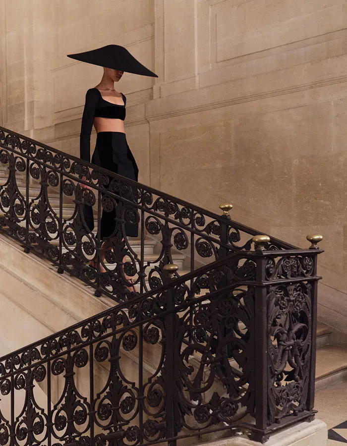 Chez Jacquemus, le passé n’est jamais figé : il est réactivé, déplacé, presque provoqué. En retournant au Musée Picasso, là même où il avait présenté un défilé fondateur en 2017, Simon Porte Jacquemus referme une boucle intime et symbolique. Cette fois, l’obsession porte un nom : Paloma Picasso. Une image en noir et blanc signée Helmut Newton, une robe noire, une bretelle glissant sur l’épaule, un verre dissimulant la poitrine — le point de départ d’une collection qui revendique une féminité affirmée, cinématographique, presque dangereuse. Les silhouettes, sans pantalon pour les femmes cette saison, sculptent le corps avec une précision implacable : jupes crayons à basques marquées, robes sablier en velours aux franges liquides, mailles seconde peau. Les références se croisent — années 50, sensualité 90s, atmosphère 80s — dans un langage devenu pleinement Jacquemus. Les hommes, eux, jouent avec les codes du smoking, du caleçon sophistiqué au vestiaire arty, comme pour rappeler que le créateur n’a jamais cessé de s’amuser. Le final, avec la reconstitution de la mythique robe une épaule de Paloma Picasso, agit comme une image-manifeste : moins un exercice d’archive qu’un passage de relais à une nouvelle génération de regards.