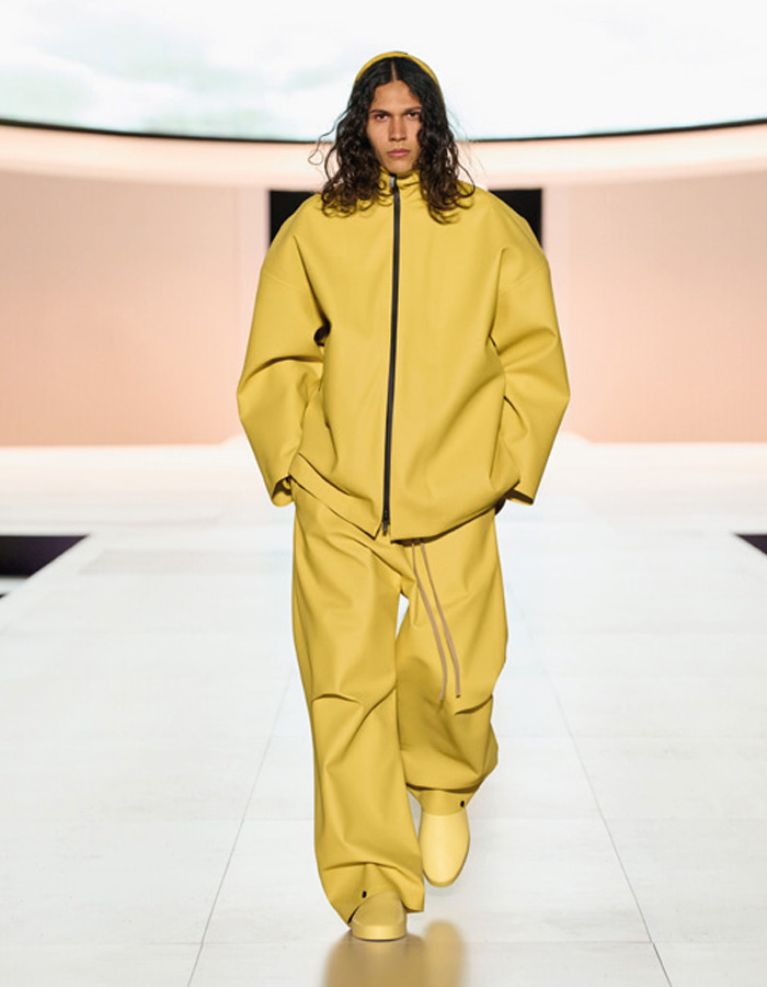 L’événement était aussi l’occasion pour le créateur de mode de présenter plusieurs pièces de « Fear of God Athletics », une collection née de son heureuse collaboration avec Adidas, faisant indéniablement entrer la marque à trois bandes dans une dimension bien plus luxueuse que lors de précédents partenariats. Au programme de cette double présentation, une déclinaison de silhouettes opulentes, notamment dans un camaïeu de beige, habillées de sublimes manteaux de fourrure. Jouant avec d’élégantes superpositions, la collection propose aussi çà et là des touches de cuir, notamment sous la forme de cordons qui viennent ceinturer la taille de blazers, le col de certains évoquant celui des kimonos.