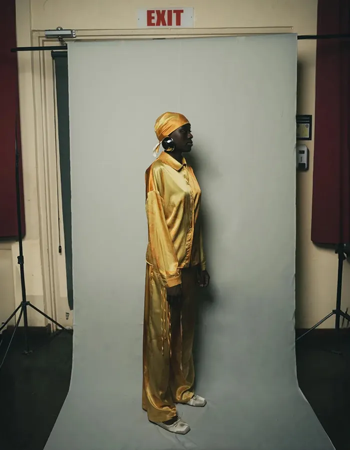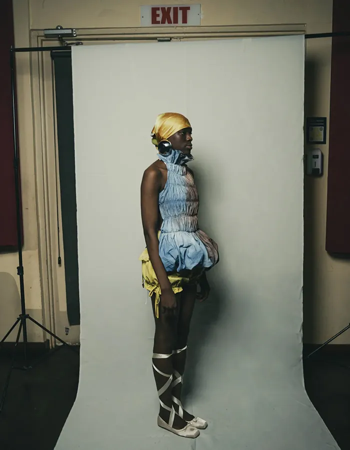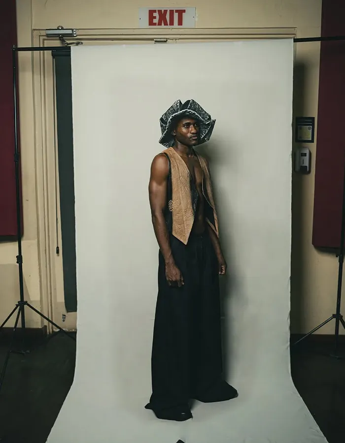 Sa collection automne-hiver 2025 incarne pleinement cette vision. Durags irisés ornés de perles, tops péplum teints à la main, denim sablé : des pièces qui allient théâtralité et désir de porter. Mais au-delà des formes, chaque vêtement affirme un style qui interroge les inégalités sociales et rejoue les contrastes entre sacré et profane, dancehall et église.