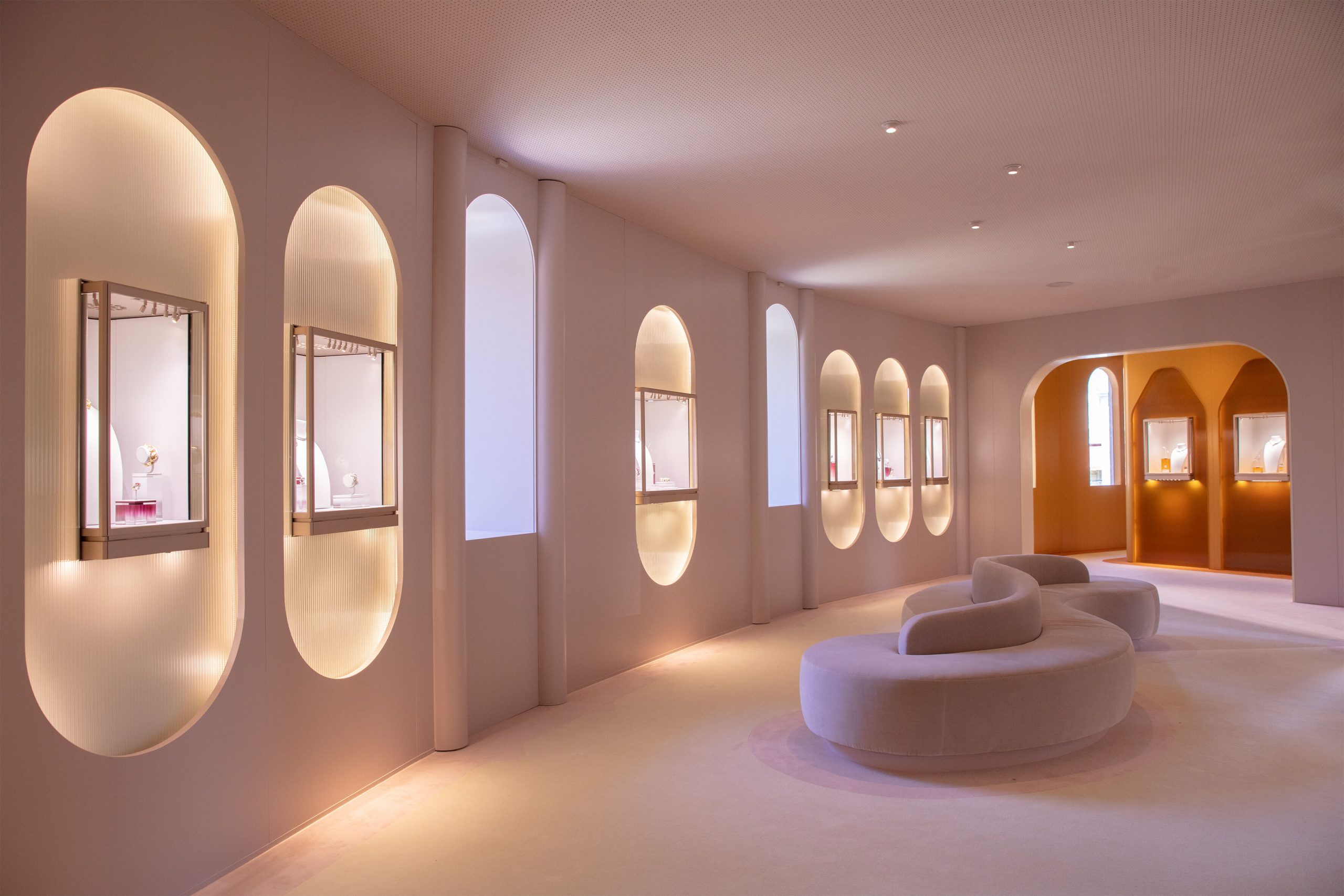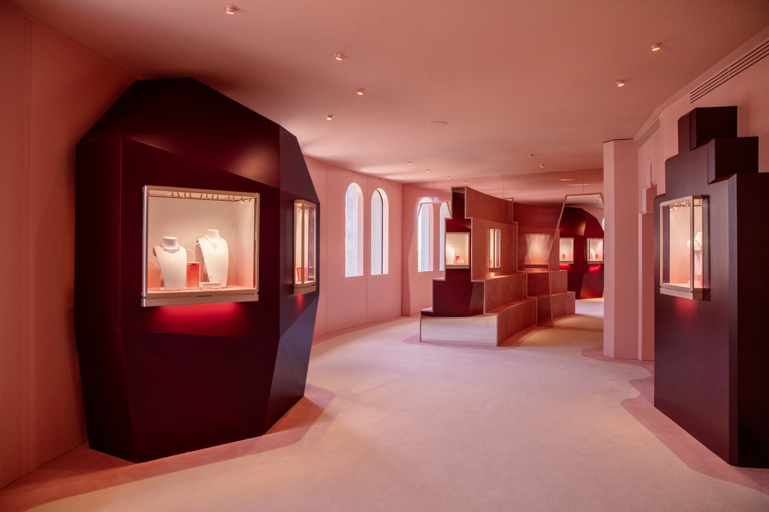 Une fois de plus, la maison Cartier a créé la surprise avec, au mois de juin, la présentation de sa nouvelle collection de haute joaillerie « Beautés du monde ». C’est à Madrid, dans l’ancienne ambassade britannique à l’architecture brutaliste, qu’elle expose ses précieuses créations. Et pour les mettre en valeur, la marque française a confié la scénographie à l’artiste et designer Jaime Hayon. Pour l’Espagnol, le défi fut de créer un volume en lien à la fois avec l’architecture circulaire du lieu aux lignes radicales et la collection aux formes organiques. Chaque espace se distingue ainsi par sa tonalité inspirée des pierres précieuses, tandis que les vitrines qui les accueillent rappellent les formes naturelles de la collection. Avec cette scénographie, Jaime Hayon réalise un véritable écrin à joyaux.