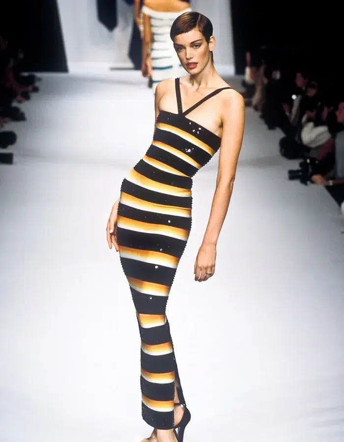 Popularisée à la fin des années 90 et début 2000, cette robe sculptante, véritable signature de la maison Hervé Léger, a façonné l’esthétique bodycon et figure parmi les pièces les plus iconiques de l’époque. Après une période d’ombre, la robe fait un retour flamboyant : Kim Kardashian l’a réactivée en avril 2024 lors d’une cérémonie du Breakthrough Prize, incarnant à nouveau l’esprit bodycon immaculé. Quelques mois plus tôt, Margot Robbie avait déjà suscité l’admiration en portant une version rayée noir et blanc pour promouvoir “Barbie”.