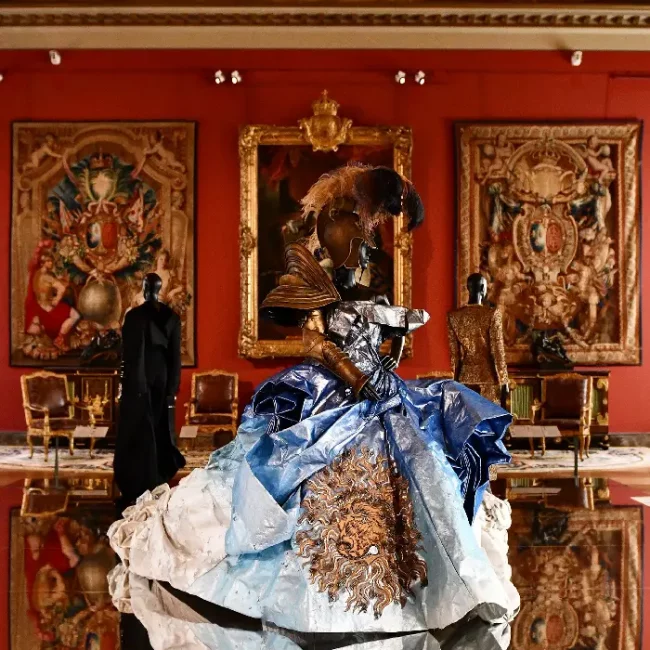 Ce décor exceptionnel n’est pas un simple accessoire : il structure l’ensemble du défilé et influe sur la façon dont les vêtements sont perçus. La collection automne-hiver, présentée autour et à l’intérieur de Drophaus, combine des silhouettes masculines revisitées — du tailleur aux pièces utilitaires — avec des palettes de couleurs allant des tons automnaux profonds à des accents pastel, tout en intégrant des matériaux innovants.