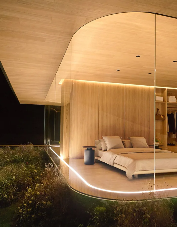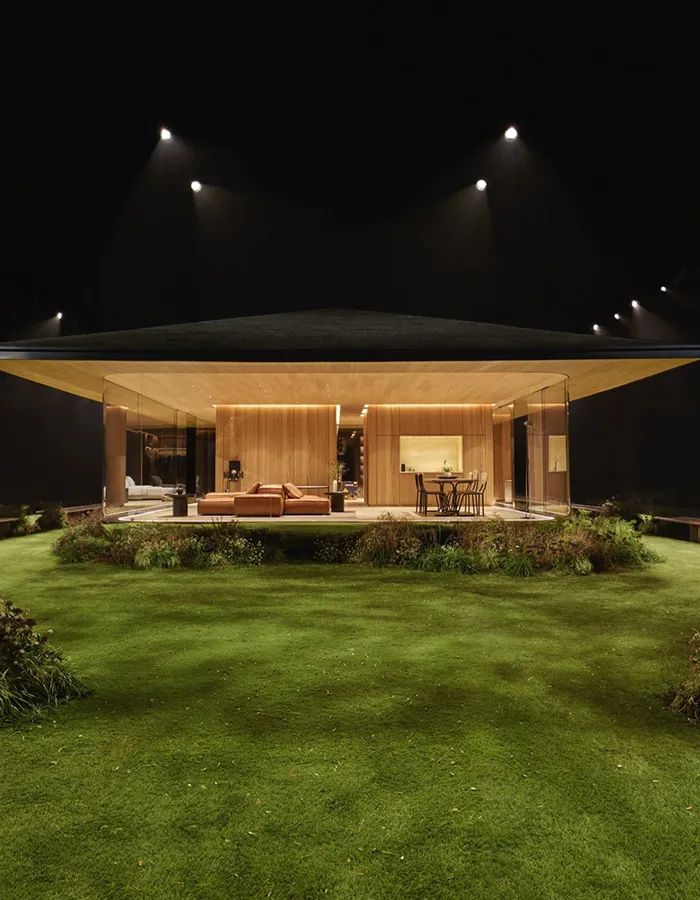 L’utilisation prédominante du verre et d’espaces ouverts a permis non seulement d’évoquer transparence et fluidité, mais aussi de créer un dialogue visuel entre la nature environnante, incluant végétation et jardin, et la scénographie du défilé. La limite entre la sphère domestique et la scène mode s’est ainsi estompée, invitant le public à redéfinir le sens du « chez soi ».
