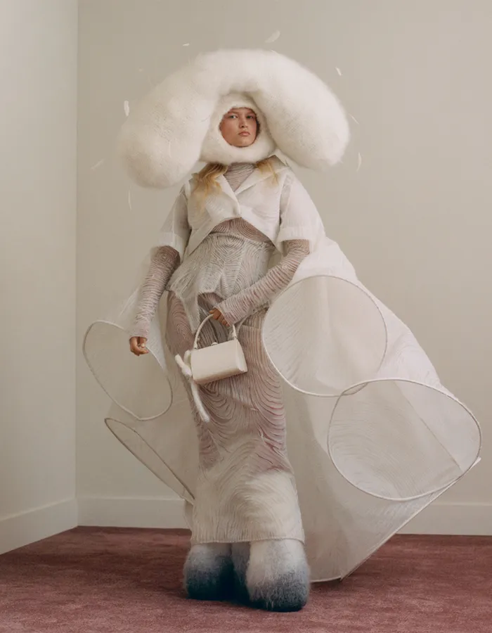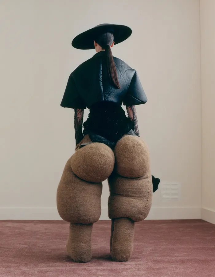 Récompensée du prix L’Oréal Professionnel Jeunes Talents 2025, elle ne cesse de faire ses preuves et devient peu à peu une référence de la pop culture. De la même manière que ses silhouettes n’ont rien d’ordinaire, son rapport à ses créations est complexe. La créatrice refuse de considérer le vêtement uniquement comme un objet de première nécessité, fuyant l’idéal esthétique et les tendances. Le message n’est pas évident mais fièrement porté par chacune des pièces. En grandissant avec un besoin de travailler au service d’une cause, elle s’est trouvé une manière d’exprimer ses idées et de controverser les récits contemporains.
