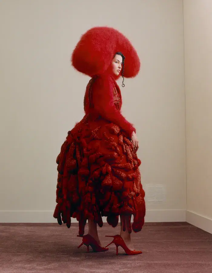 Libre dans sa manière de s’exprimer, elle a instantanément donné un ton enchanteur à sa collection. En prenant des risques, elle ne se rend pas toujours compte du besoin de susciter l’attrait pour ses réalisations. Son processus de création tient de l’expérimentation car, en osant déranger, elle s’autorise à dépasser les limites autant dans l’espace que dans la conception de ses pièces. En effet, elle utilise des techniques peu conventionnelles telles que le crochet, dont elle se sert à outrance pour créer de réels effets d’optique.