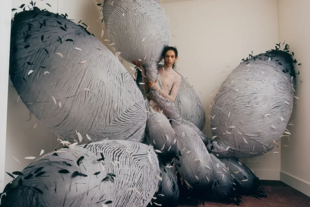 Myah Hasbany s’intéresse à des concepts de dysmorphie et de genre en donnant à son travail une orientation fortement satirique. Sa dernière collection, inspirée d’un crash d’ovni, matérialise le principe de marginalité. Elle nous offre un échantillon de sa perception de la beauté en discordance avec les principes esthétiques fondamentaux selon la société. Il lui a fallu près d’un an pour réaliser sa plus grande pièce, à base de crochet et de plumes, créant un être tentaculaire impressionnant volant dans les airs.