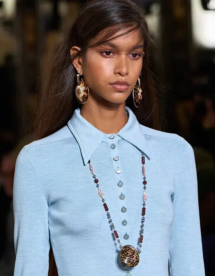 On parle souvent d’équilibre dans la mode, entre deux couleurs, les proportions de la silhouette… La tenue se conçoit selon une harmonie entre les formes qui la composent : taille cintrée, décolleté, manches longues, coupe mi-jambe, mini, col roulé… Il a toujours été normal de dégager le cou pour y mettre des colliers. On a toutefois observé pendant la Fashion Week printemps-été 2026 que les colliers ornaient les cols fermés pour changer l’allure. La silhouette gagne ainsi en force et prend une tout autre dimension. En surchargeant le haut du corps, on le structure différemment, en renforçant le caractère. Un jeu de contraste entre rigueur et audace qui redéfinit la manière d’aborder l’accessoire.