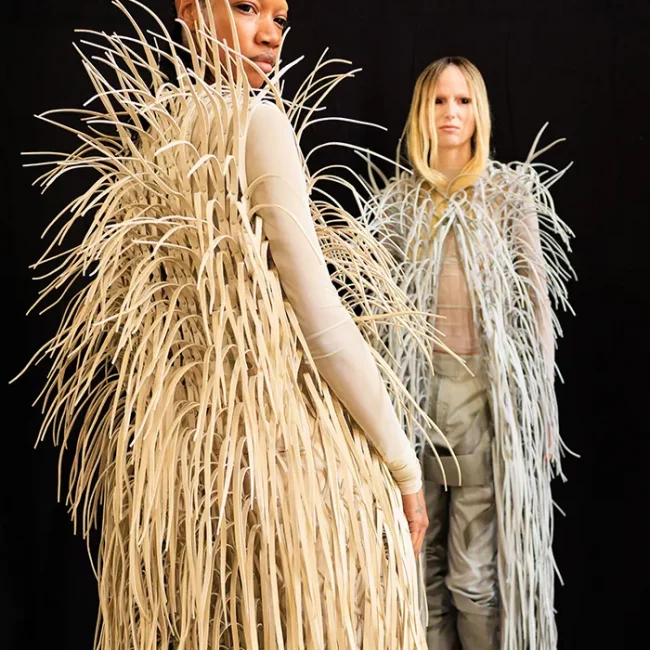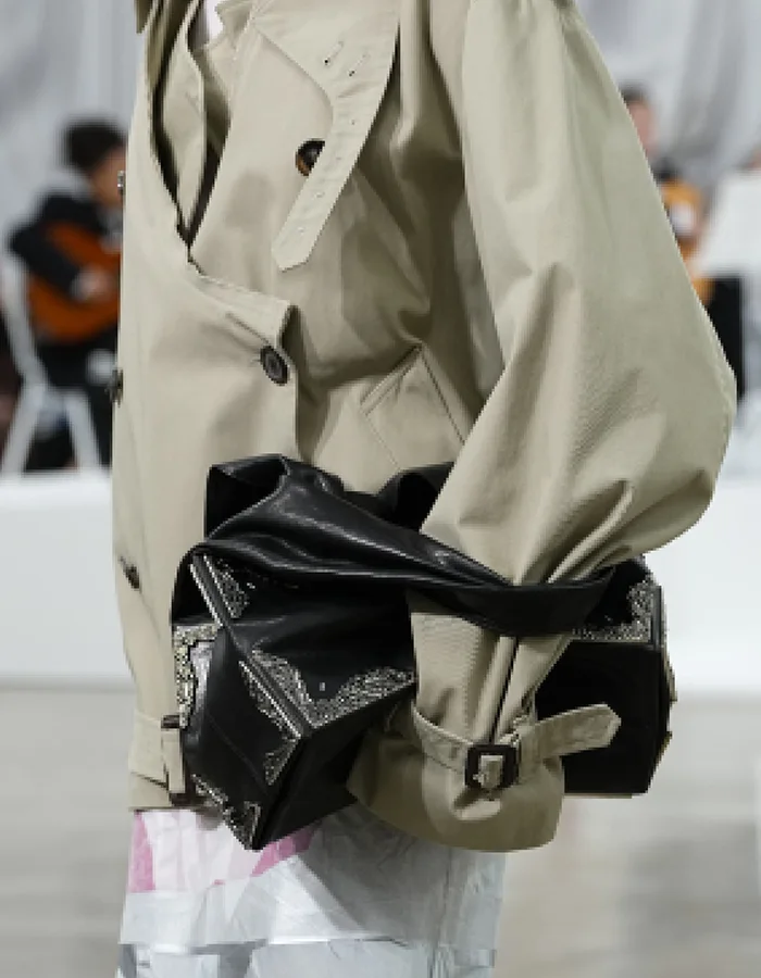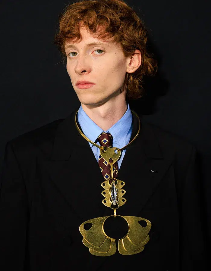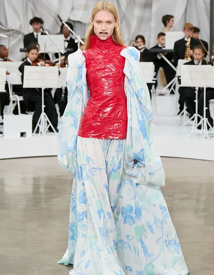 Glenn Martens a rendu hommage à l’esprit originel tout en imposant sa vision. Le défilé s’est ouvert sur une bande-son jouée par des enfants, clin d’œil à l’iconique show de 1990. Les silhouettes, taillées dans le cuir, le denim et la laine, réinventent le tailoring à travers des volumes libres. Les « four stitches » emblématiques deviennent bijoux métalliques, symboles d’une maison qui refuse d’être figée. Glenn Martens réussit à mêler mémoire et mutation, avec une sincérité rare.
