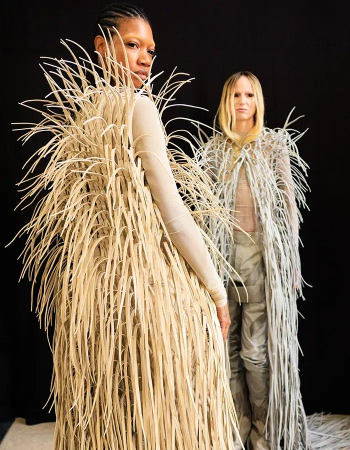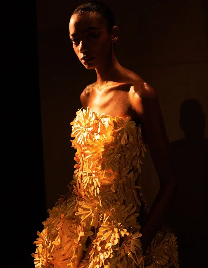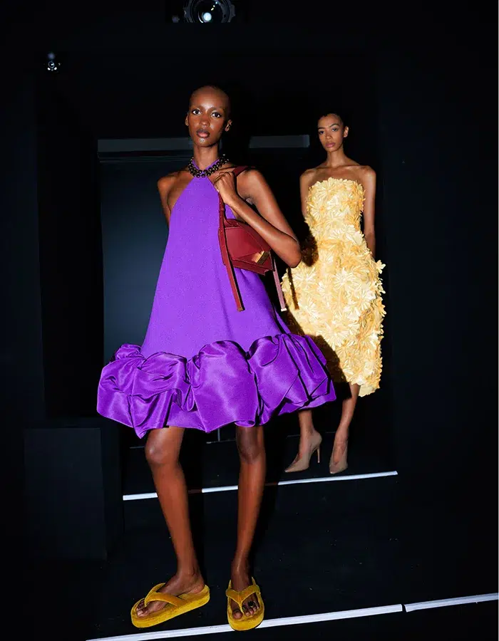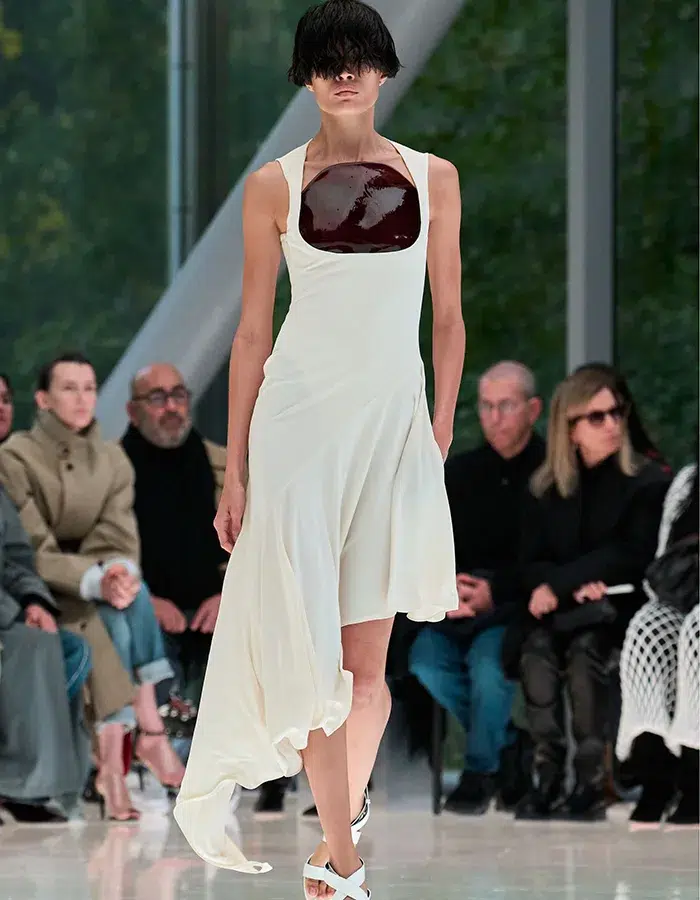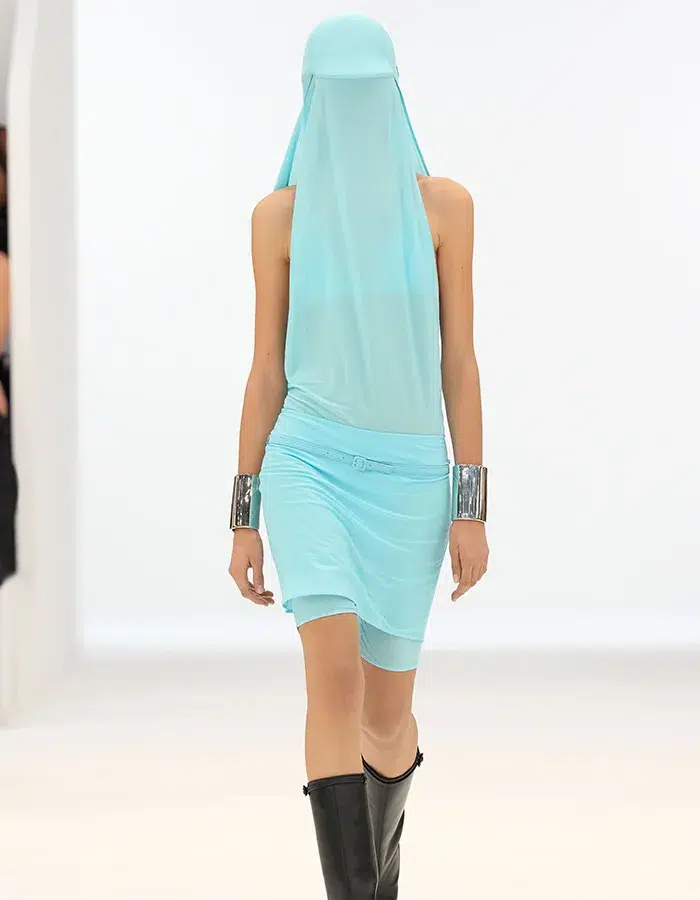 Nicolas Di Felice a plongé le public dans une lumière aveuglante. Le show, intitulé Blinded by the Sun, proposait une expérience sensorielle où le vêtement devient protection. Mini-jupes, visières futuristes, capes et transparences : tout semblait prêt pour affronter une chaleur nouvelle. Une collection solaire, presque utopique, où le futur se dessine à travers la simplicité.
