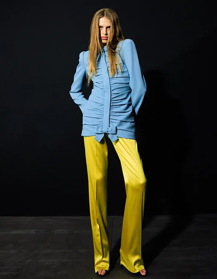 Alessandro Michele a transformé le défilé en un véritable manifeste poétique. Inspiré d’une lettre de Pasolini sur les lucioles, il a célébré la lumière qui résiste à l’obscurité. Entre blouse bleu paon et pantalon chartreuse, il a cherché la simplicité sans renoncer à la magie. Les robes, drapées et fluides, semblaient respirer un nouvel élan. La performance spoken word de Pamela Anderson, suivie d’un final scintillant évoquant le vol des lucioles, a offert un moment suspendu et profondément émouvant.