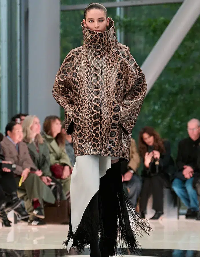 Pieter Mulier a poursuivi l’œuvre du maître avec une rigueur sensuelle. Les pièces en coton, cuir, soie ou ornées de l’imprimé python dessinent une tension entre force et fragilité. Chaque vêtement épouse le corps, suspendu dans un équilibre entre précision et émotion. L’artisanat devient invention, les franges dansent, les torsions sculptent. Alaïa reste une maison de pureté, d’extrême beauté, où le corps vibre comme un manifeste.