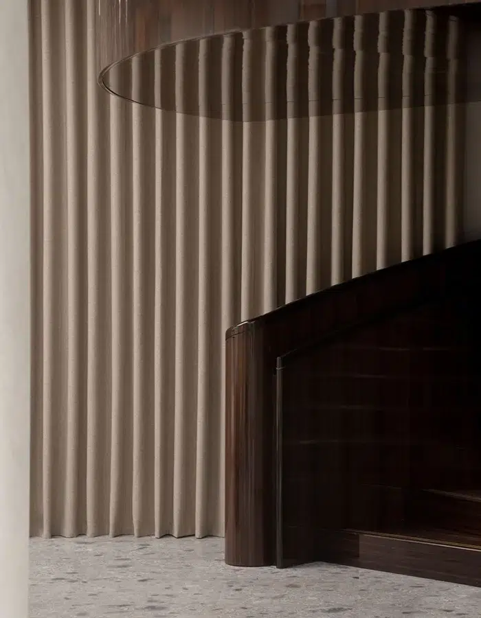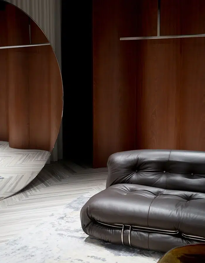 Celle de l’avenue Montaigne, à Paris, s’est offert un style plus épuré, sans être surchargée de décoration. Les matériaux sélectionnés – bois, cuir, acier, marbre – sont bruts et nobles, instaurant une intemporalité exemptée de toute allusion à une époque quelconque. La majorité des meubles sont circulaires et tout en finesse, créant une ambiance chaleureuse.