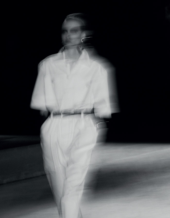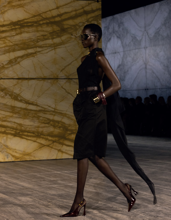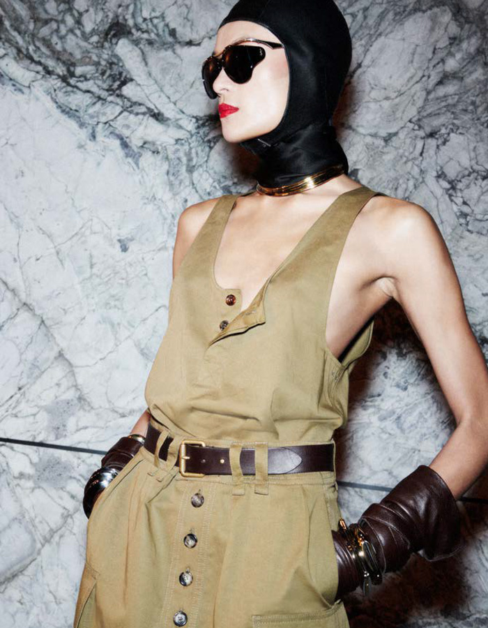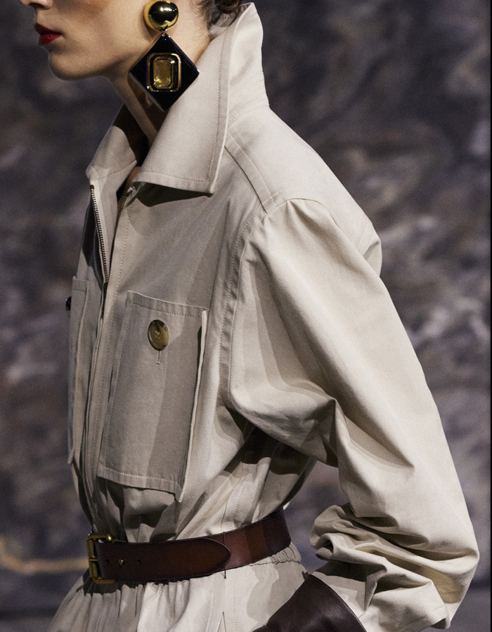 La collection se transforme alors en la quintessence de l’élégance avec une sophistication affirmée, où les éléments de la garde-robe masculine sont repris pour devenir durablement féminins. Les variations de la saharienne, imaginée par Yves Saint Laurent en 1967, rejoignent l’ensemble, sans oublier les combinaisons. Les créations sont issues du vestiaire utilitaire, mais en devenant ceinturées, elles créent des silhouettes délicates. Le coton et le lin, matières majeures de cette ligne printemps-été 2024, rejoignent les couleurs terreuses allant de l’olive au marron en passant par le sable et la craie. La collection apporte la touche finale à son raffinement par l’utilisation de gants en cuir, de talons hauts, d’accessoires et de cagoules d’aviateurs.