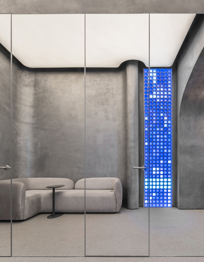 Dans le deuxième hall, trois cabines d’essayage classiques accueillent plusieurs fauteuils, avec des portes en miroir qui agrandissent les lieux. L’ensemble est sublimé par un mobilier fabriqué sur mesure et des caissons lumineux, aux murs et au plafond, pour colorer et éclairer uniformément les cabines, les vitrines et les espaces de réception. À travers ce showroom, l’équipe de Balbek a réussi à maintenir et à mettre en place un projet en période de guerre, où les obstacles n’ont eu de cesse de se multiplier, pour ainsi offrir une vision nouvelle à un public expérimenté et exigeant.