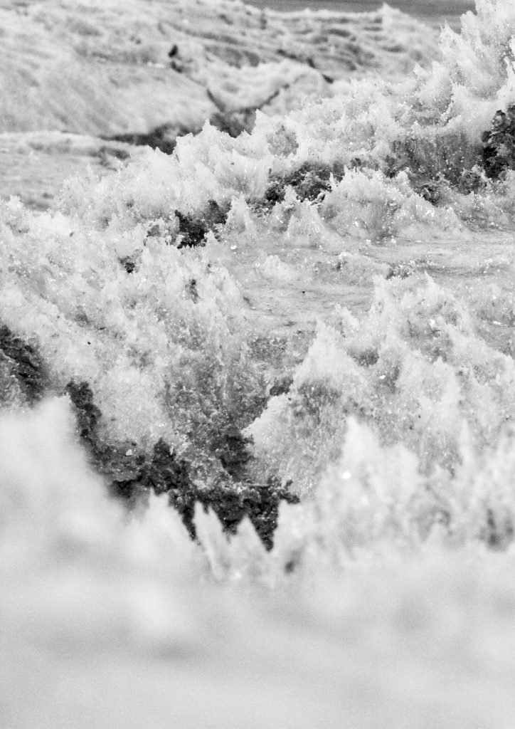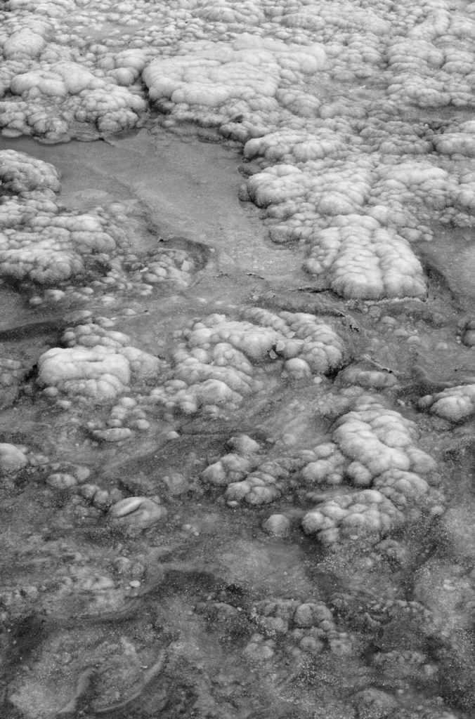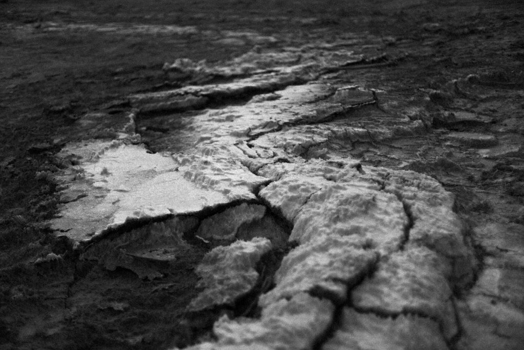 Issues de cette terre déliquescente, marquée par les stigmates du temps et de l’effacement, les images de sa série Les Dolines, entreprise depuis 2016, résonnent tout particulièrement dans le contexte actuel… Roche crayeuse, Vague cristallisée, Salines ou plantes aquatiques cadrées en gros plan apparaissent comme des fantômes figés dans leur gangue de sel. Collectant les traces organiques et minérales d’une terre exsangue, Ilanit Illouz non seulement alerte sur les ravages de l’extractivisme, mais, utilisant le sel pour cristalliser ses images, rejoue aussi le processus de fossilisation à l’œuvre. Donnant une tournure presque sculpturale à ses photographies incrustées de cristaux de sel, elle leur donne aussi une dimension allégorique. Allégorie de la désagrégation, de l’effondrement des sols (et des nations ?), mais aussi de la dissolution de l’image. C’est d’ailleurs l’étude des origines de la photographie, à travers l’usage du bitume de Judée comme produit photosensible par Nicéphore Niépce, l’inventeur de l’héliographie, dès 1922, qui motiva le premier voyage de l’artiste…
