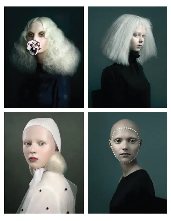 Si le procédé – illustré, notamment, par Frank Horvat dans les années 1980 – n’est pas nouveau, il fait mouche. Faisant rejouer ainsi la scène de La Lettre de Vermeer à son modèle, Justine Tjallinks joue habilement du mimétisme (de la posture, des couleurs, du décor…) et de l’anachronisme (à travers la modernité presque futuriste de la coiffure et des tissus) pour créer une collision du passé et du présent. Évoquant tour à tour les intérieurs hollandais d’un Ter Boch ou d’un Van Hoogstraten, les portraits d’Antoine van Dyck ou Frans Hals, tout en faisant s’interpénétrer les temporalités (dans les séries Modern Times et Passé notamment), l’artiste fait subrepticement apparaître l’anormalité. Ainsi de la difformité à la fois si troublante et si attachante des visages des enfants atteints du syndrome de Down (The Leftlovers), ou de l’albinisme auquel l’artiste consacre une lumineuse série, Jeweled, en 2016, parvenant à faire de cette anomalie un attribut féerique…