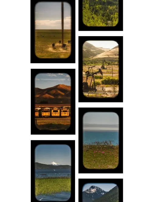 Certaines photographies ressemblent à des peintures de paysage, révélant des bandes contrastées de couleur, comme le ciel dégagé, les cimes enneigées, le lac aux eaux transparentes et la nature verdoyante. D’autres évoquent une poésie visuelle (un arbre courbé donnant l’impression de former un cercle), ou combinent des formes improbables (une rangée de bus scolaires garés face à des montagnes éclairées par le soleil de l’aube), ou encore s’amusent avec les symétries (une ruelle de Chicago en alignement parfait avec les fils électriques et la route qui coupe la voie ferrée).