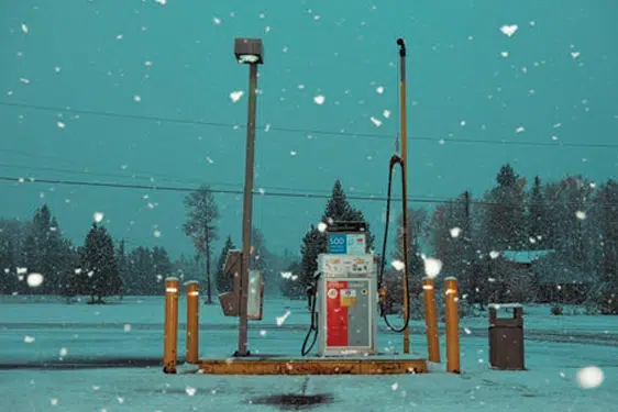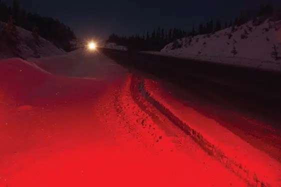 Une route dans un Blizzard bleuté, un gros plan sur une cabine téléphonique, une pompe à essence ou l’enseigne d’un motel éclairé d’une lumière rouge, comme la trace d’une roue dans la neige paraissant ensanglantée… comme les doigts d’une main elle aussi prise en gros plan… Rouge également comme le Skaï d’un fauteuil vide de voiture pris, lui aussi, en gros plan, ou les dossiers auxquels s’agrippe un homme au regard perdu… Procédant par leitmotiv, échos et répétitions, la photographie de Kourtney Roy (née en 1981) est intrinsèquement obsédante parce que esthétiquement obsessionnelle. Obsessionnelle à travers les motifs (routes désertées, enseignes, ciels, nuits, brouillards, neige…), les couleurs (où prédominent le rouge sang et le bleu piscine) et les cadrages (essentiellement en plans rapprochés ou extra larges).