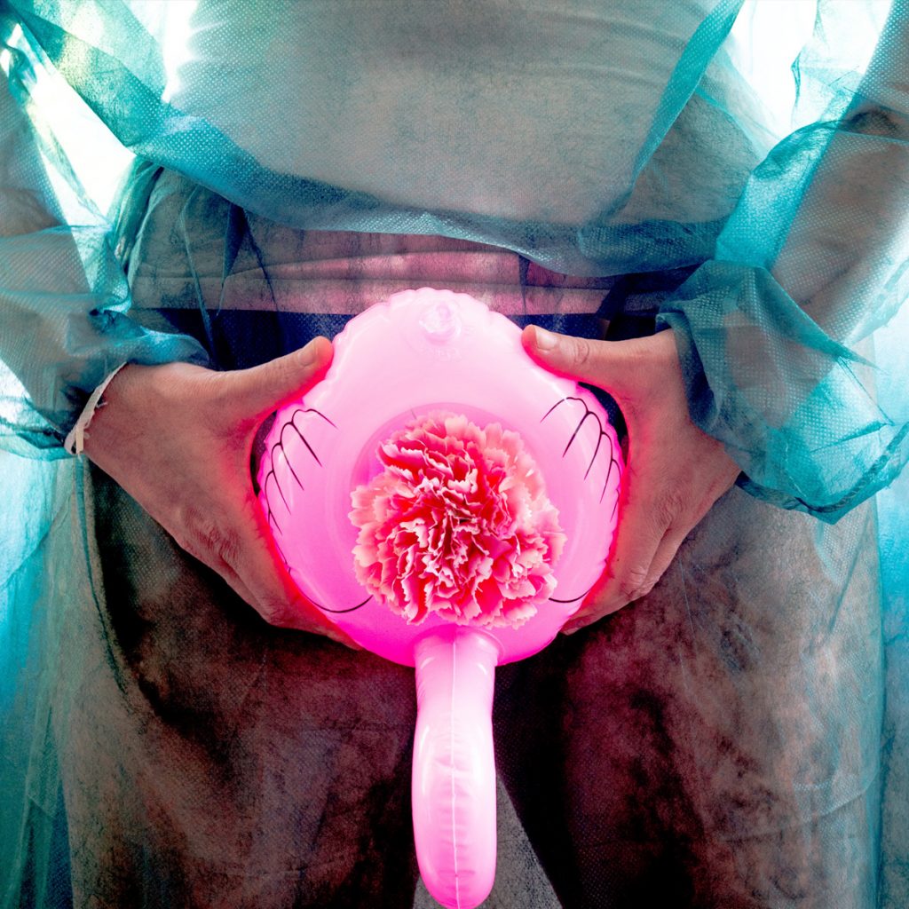 Interlude in Blue est une série d’autoportraits qui aborde la solitude urbaine, l’isolement, l’aliénation, la dislocation sociale et psychologique, et l’éloignement de soi. La photographe explore cette fissure entre l’identité de l’être et sa réalité dans le monde, tout en évoquant la beauté de la rêverie et le sujet contemplé, tourné sur lui-même. Le personnage féminin, de dos et non identifié, invite le regardeur à un dialogue entre visible et invisible, réalité et effet de réel dans la scénographie. La lumière très cinématographique vient sublimer la juxtaposition des couleurs intenses. De son côté, Filter Object remet en question les constructions identitaires autour des notions de féminité et de représentation du corps féminin. Ioanna Natsikou s’amuse avec tout type d’objet et de matériau qu’elle dépouille de leur sens en vue de créer d’autres perceptions sensorielles. La silhouette féminine fragmentée sert de toile pour mettre en exergue cette étrangeté dans un processus ludique, surréaliste et poétique. Dans ces deux séries, tout se combine ainsi à merveille pour briser les stéréotypes, déclencher les fantasmes, les mystères et les ambiguïtés, et réinterroger le sens de la beauté, de l’érotisme et de la féminité.